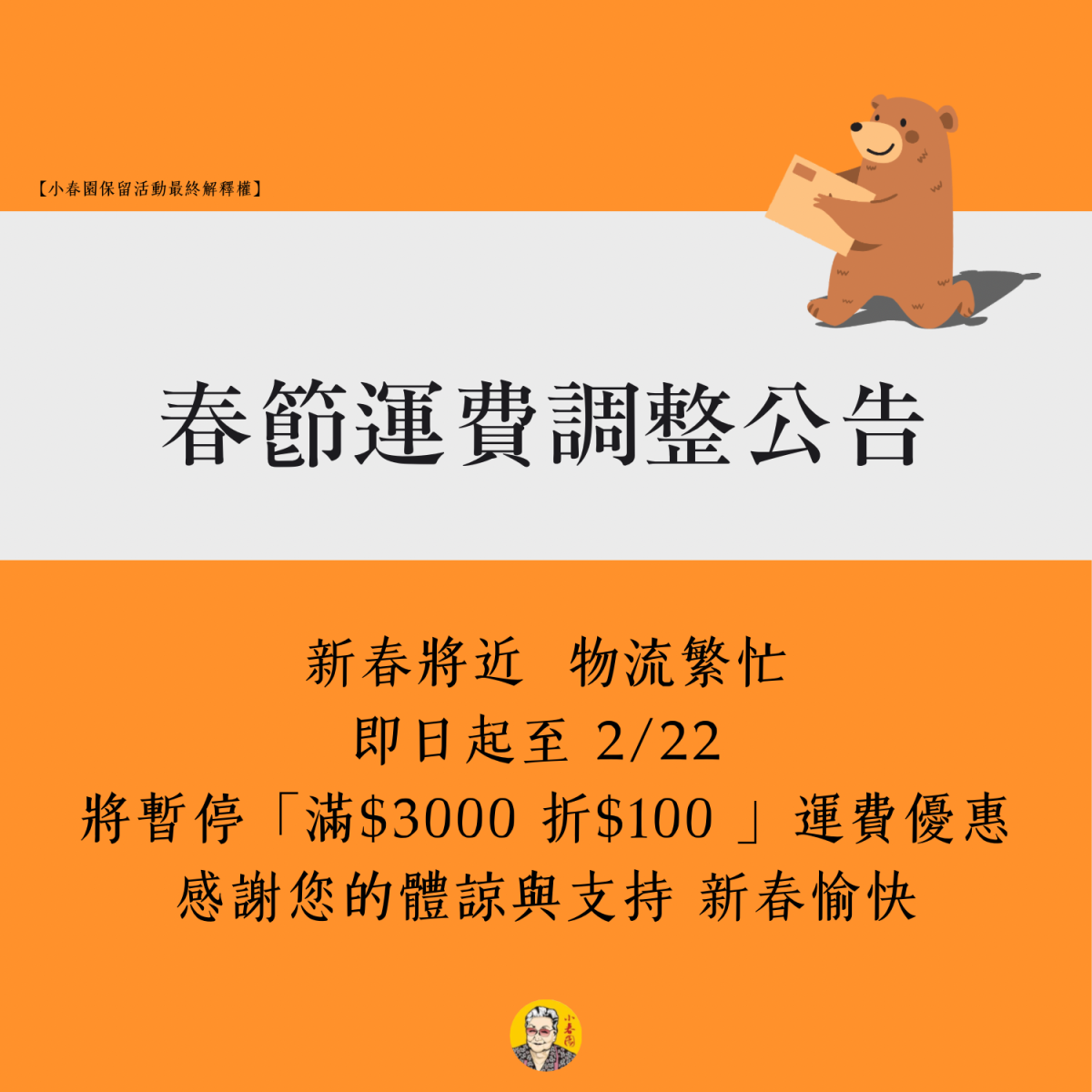 【即日起至 2/22,將暫停「滿 $3000 折 $100 」的運費優惠】